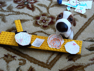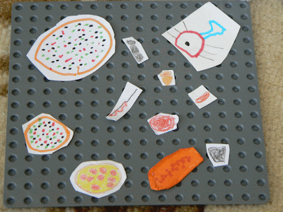 Momenteel favoriete bezigheid: restaurantje. Al het eten wordt getekend. Links en onder pizzas, het zwarte vierkantje is de prullebak, het rode rondje is biefstuk, daarboven een ijsje en een worstje, een sis kebab en een chocoladereep. Helemaal bovenin rechts is een zwart gat (uit de ruimte).