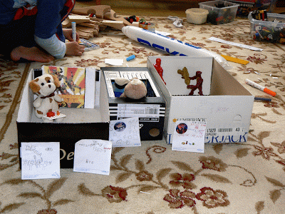 Na het eerste bioscoopbezoek werd thuis de hele bioscoop nagebouwd. De middelste doos is de kaartverkoop. Rechts speelt spiderman, links zit Harryin (vrouwelijke vorm van Harry) een menu te eten.
