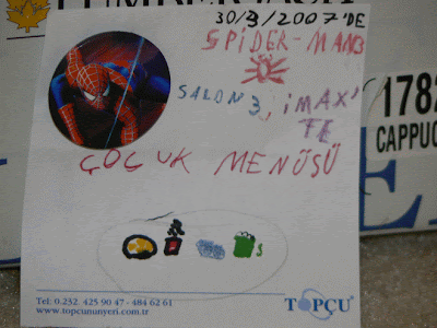 De affiches van de bioscoop incl. bioscoopmenu (popcorn en cola). Happy feet is van Timucin, Spiderman van Emre.
