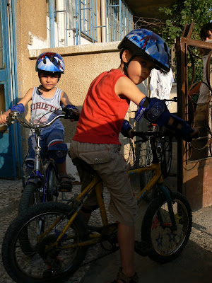 Aan de andere kant, ik zag de man die het bloed prikte vreemd opkijken toen ik hem hartelijk bedankte en hem vertelde dat hij zulke kundige handen had. Ik meende het ook echt, en ik zag dat het hem goed deed om een compliment te krijgen..... dus de medische kant voelt zich misschien net zo veronpersoonlijkt (is dit nog Nederlands of heb ik dit nu ter plekke bedacht) als de patient. Maar Emre is weer helemaal de oude en zit weer op de fiets. Maar wel met hoofdbescherming ditmaal.